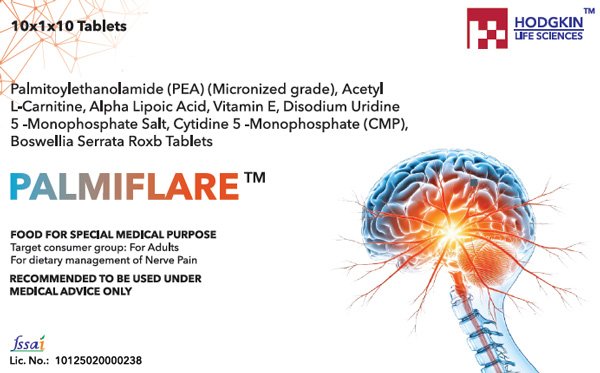 Composition: Palmitoylethanolamide (PEA) (Micronized grade) 300mg, Acetyl L-Carnitine 150mg, Alpha Lipoic acid 50mg, Vitamin E 5mg, Disodium Uridine 5 - Monophosphate Salt 9mg, Cytidine 5 – Monophosphate (CMP) 15mg, Boswellia Serrata Roxb. 50mg Tablets