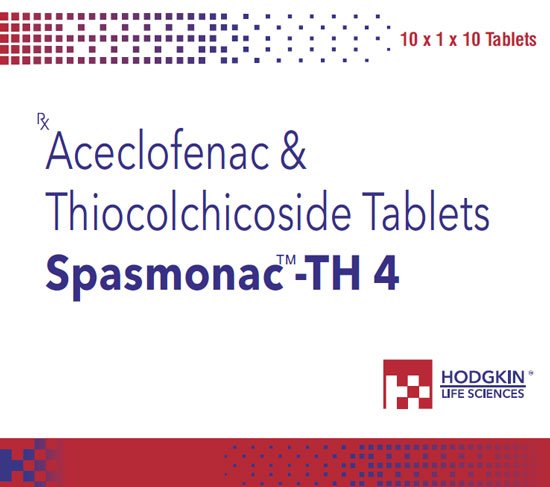 Composition: Aceclofenac 100mg + Thiocolchicoside 4mg Tablets